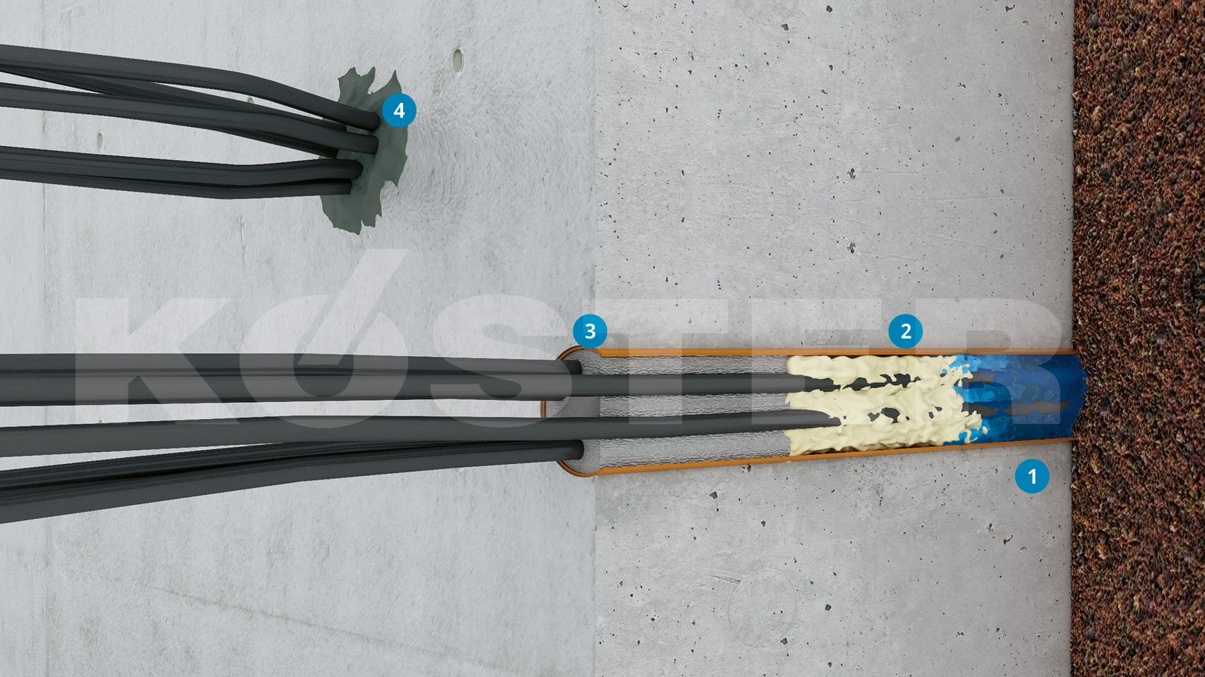 El compuesto permanentemente plástico KÖSTER KB-Flex 200 proporciona una forma confiable y fácil de permitir la instalación de nuevas líneas o pasos en el futuro. El material absorbe el movimiento en las instalaciones y no se rompe. KÖSTER KB-Flex 200 es permanentemente resistente a las sustancias que normalmente se encuentran en el subsuelo y las aguas subterráneas.