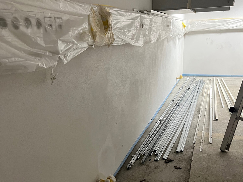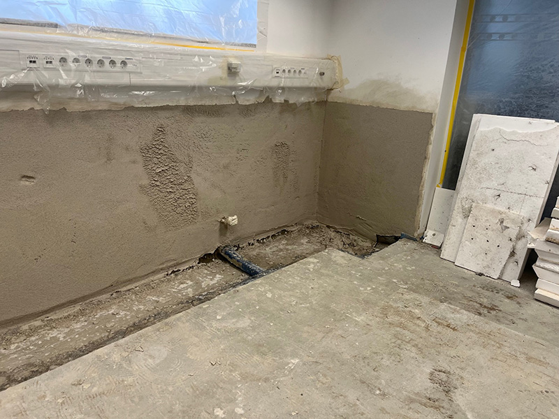 Die Wände der als Büro- und Laborräume genutzten Räumlichkeiten wiesen sichtbare Schäden wie Blasenbildung am Putz und Farbschäden auf. Eine Laborprobe ergab, dass der Feuchtigkeitsgehalt der Kelleraußenwände zu hoch war.