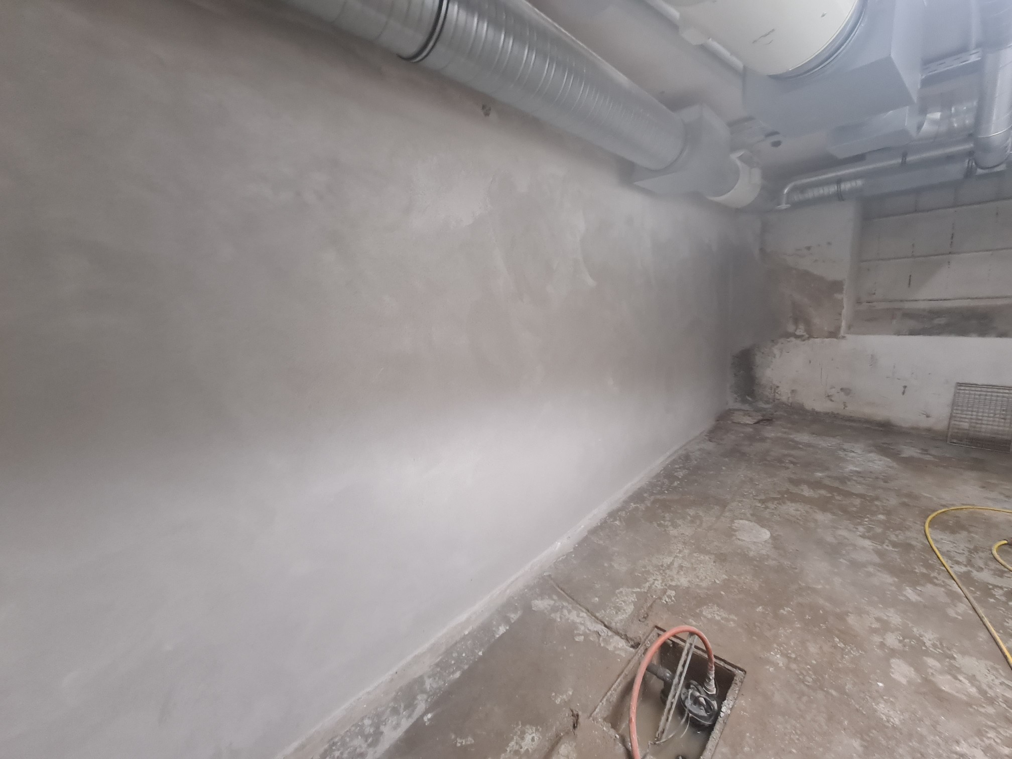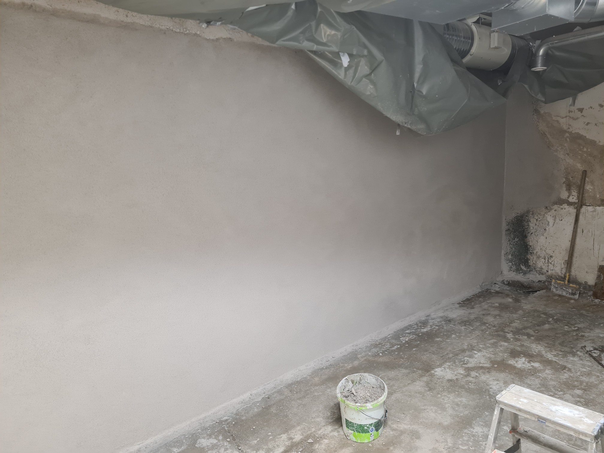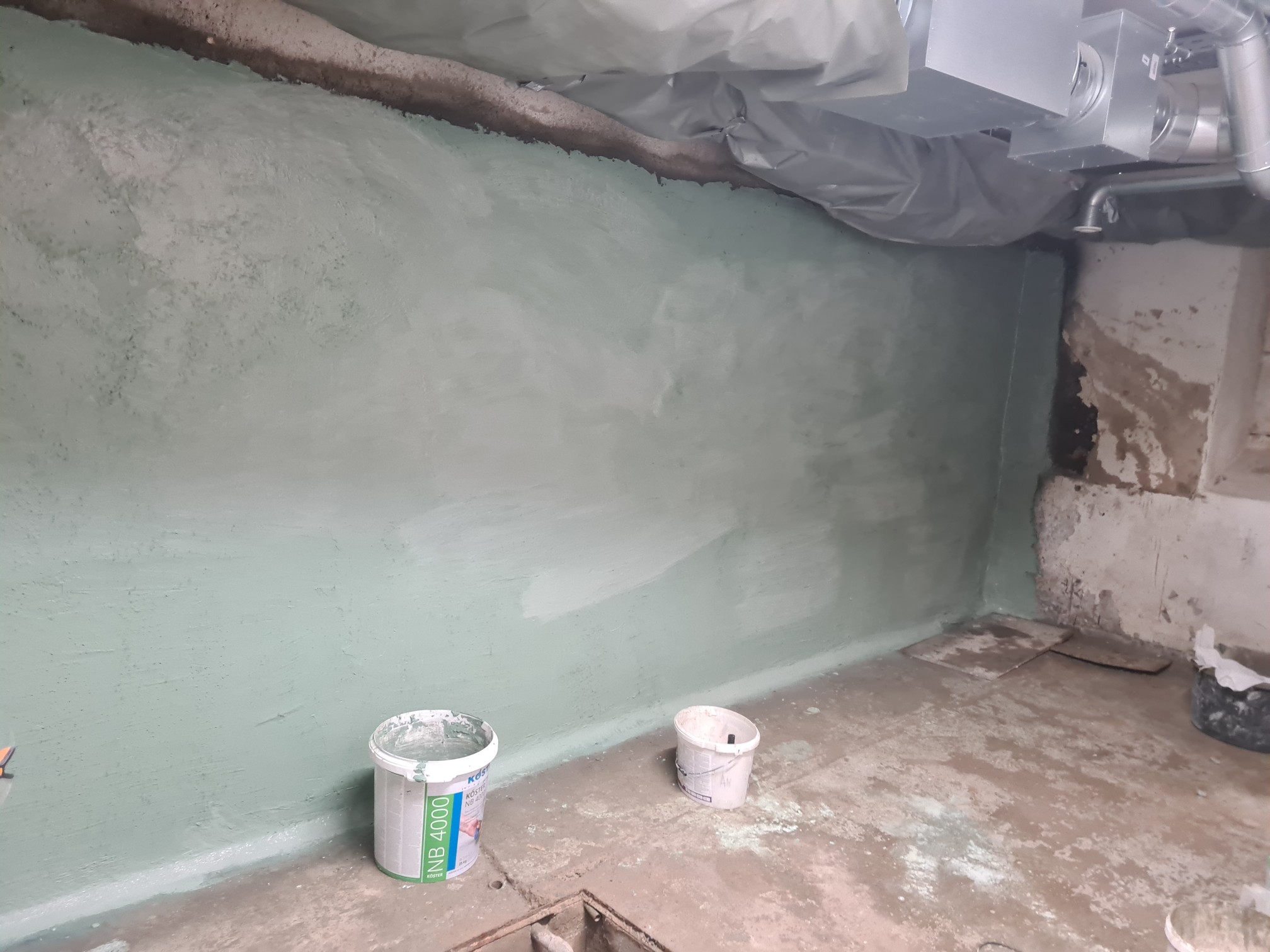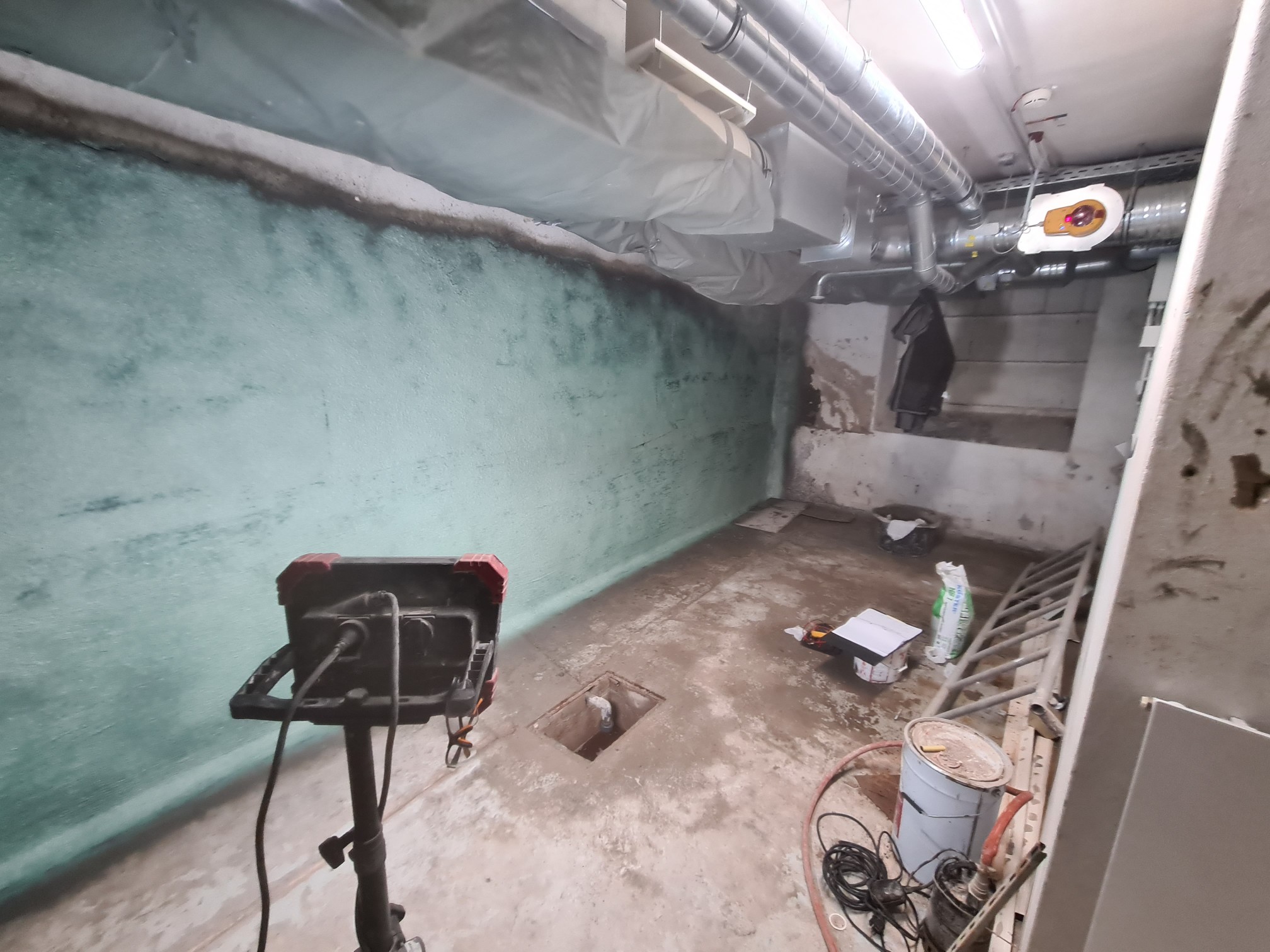Die Kellerinnenabdichtung wurde folgendermaßen durchgeführt: Zwischen Außen- und Innenwand befand sich ein Hohlraum von 2 cm, welcher mit KÖSTER Injektionsgel G4 verfüllt wurde. Anschließend wurde die mineralische Innenabdichtung KÖSTER Sperrmörtel WU als Ausgleichsschicht aufgetragen und darauf die Dichtungsschlämme KÖSTER NB 1 grau zweilagig aufgetragen. Auf die starre mineralische Abdichtung wurde als zusätzlicher Schutz die KÖSTER NB 4000 Hybridabdichtung zweilagig aufgebracht. Abschließend wurde KÖSTER Sperrmörtel Spritzbewurf aufgetragen und mit KÖSTER Sanierputz 2 cm verputzt.