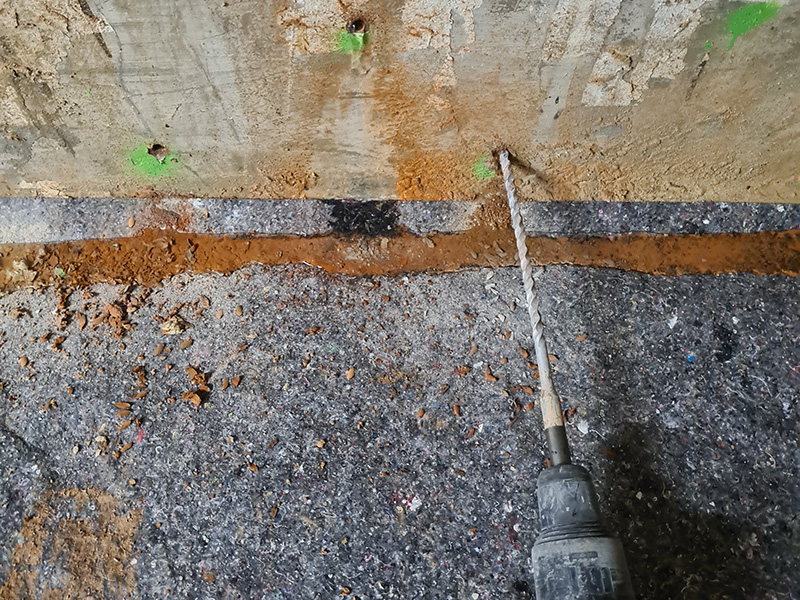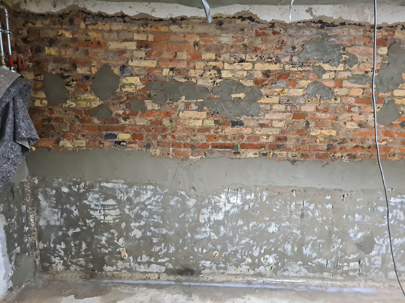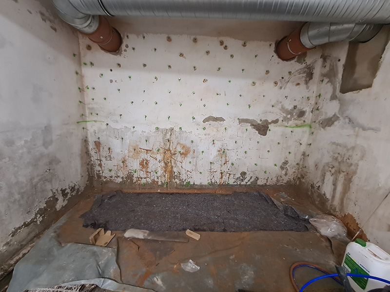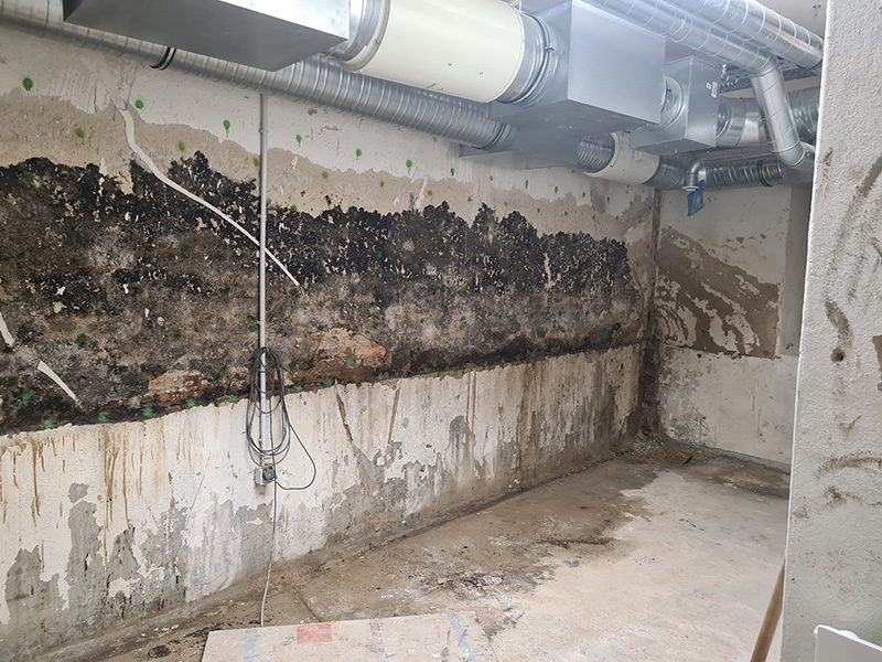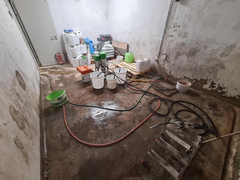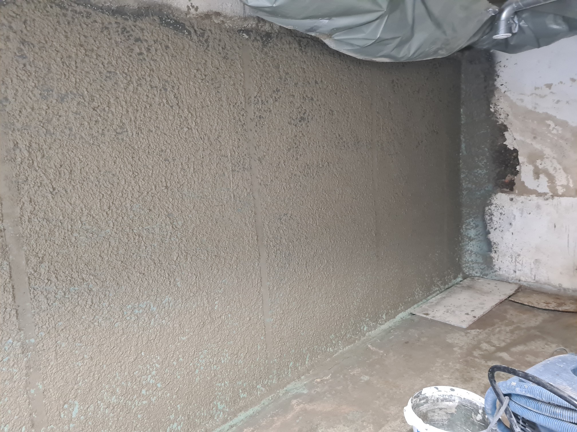 Die Kellerinnenabdichtung wurde folgendermaßen durchgeführt: Zwischen Außen- und Innenwand befand sich ein Hohlraum von 2 cm, welcher mit KÖSTER Injektionsgel G4 verfüllt wurde. Anschließend wurde die mineralische Innenabdichtung KÖSTER Sperrmörtel WU als Ausgleichsschicht aufgetragen und darauf die Dichtungsschlämme KÖSTER NB 1 grau zweilagig aufgetragen. Auf die starre mineralische Abdichtung wurde als zusätzlicher Schutz die KÖSTER NB 4000 Hybridabdichtung zweilagig aufgebracht. Abschließend wurde KÖSTER Sperrmörtel Spritzbewurf aufgetragen und mit KÖSTER Sanierputz 2 cm verputzt.