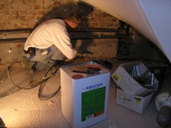 Abdichtung der Kellerwände (d=0,70m) durch Injektion mit KB PUR Gel Verputzen der Wände mit KÖSTER Sanierputz Weiß